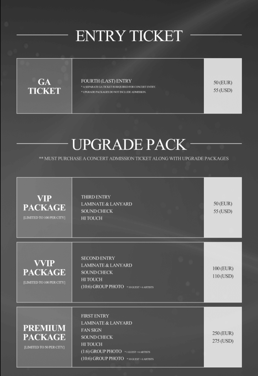 Wichtig: VIP- oder VVIP-Upgrades gelten nur mit GA-Ticket. Also zuerst das Konzertticket sichern, dann upgraden! Sonst gelten diese nicht.